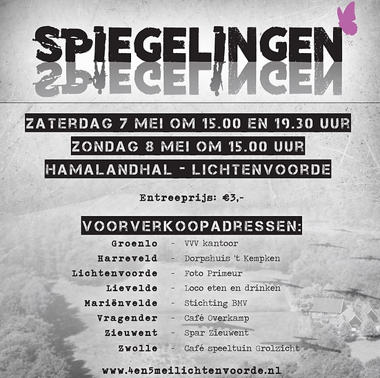 Deze theatervoorstelling zal op 7 mei (’s middags en ’s avonds) en op 8 mei (’s middags) in totaal drie keer in de Hamalandhal te Lichtenvoorde opgevoerd gaan worden.